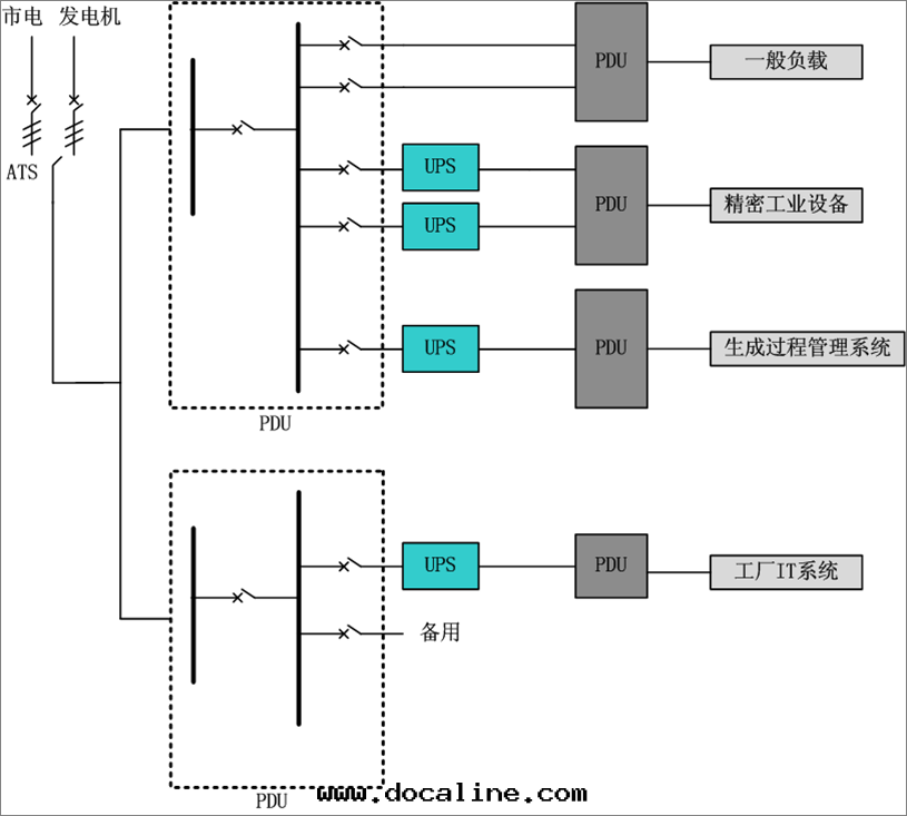 根(gēn)據(jù)負载類(lèi)型的(de)不(bù)同(tóng),可(kě)以(yǐ)分(fēn)别配置不(bù)同(tóng)類(lèi)型的(de)UPS産品以(yǐ)提(tí)高(gāo)系(xì)統的(de)可(kě)靠性(xìng)。如(rú)图(tú)1所(suǒ)示,市電(diàn)電(diàn)源與(yǔ)發(fà)電(diàn)機(jī)組作(zuò)为(wèi)工廠(chǎng)的(de)两(liǎng)路(lù)總(zǒng)的(de)主(zhǔ)供電(diàn)電(diàn)源,通(tòng)过(guò)ATS自(zì)動(dòng)切(qiè)換開(kāi)關(guān)進(jìn)行切(qiè)換。經(jīng)过(guò)配電(diàn)之(zhī)後(hòu),接入(rù)UPS系(xì)統。一(yī)般来(lái)说(shuō),精密工業設備推薦UPS並(bìng)機(jī)系(xì)統以(yǐ)保障其(qí)供電(diàn)可(kě)靠性(xìng),同(tóng)时(shí),根(gēn)據(jù)具體(tǐ)負载類(lèi)型的(de)不(bù)同(tóng),需要(yào)詳细(xì)分(fēn)析UPS産品的(de)带(dài)载能(néng)力。現(xiàn)在(zài)工業的(de)衆多(duō)生(shēng)産設備均为(wèi)沖击性(xìng)負载,因(yīn)此(cǐ)UPS産品的(de)耐沖击電(diàn)流能(néng)力必須达到(dào)其(qí)要(yào)求才可(kě)配置應(yìng)用(yòng)。