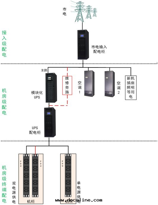 按中(zhōng)小型數據(jù)中(zhōng)心(xīn)業務(wù)性(xìng)質(zhì),可(kě)選用(yòng)C級(基本(běn)級)供配電(diàn)系(xì)統,滿足中(zhōng)小型數據(jù)中(zhōng)心(xīn)IT設備可(kě)靠性(xìng)用(yòng)電(diàn)要(yào)求。采用(yòng)單路(lù)市電(diàn)電(diàn)源为(wèi)數據(jù)中(zhōng)心(xīn)機(jī)房(fáng)UPS(不(bù)間(jiān)斷供電(diàn)電(diàn)源)、機(jī)房(fáng)空(kōng)調、新(xīn)風(fēng)、照明(míng)、維修插座等設備供電(diàn)。市電(diàn)電(diàn)源正(zhèng)常運行情況下(xià),保證機(jī)房(fáng)設備運行不(bù)中(zhōng)斷。