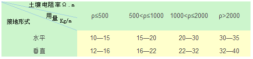 降阻劑的(de)經(jīng)濟用(yòng)量(liàng)應(yìng)視不(bù)同(tóng)的(de)土壤而(ér)定(dìng),在(zài)接地(dì)體(tǐ)上(shàng)的(de)敷設厚度(dù)應(yìng)在(zài)5—15CM之(zhī)間(jiān),为(wèi)方(fāng)便計(jì)算,推薦用(yòng)量(liàng)如(rú)下(xià)表(biǎo):