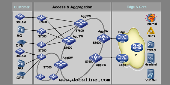 在(zài)宽(kuān)带(dài)城(chéng)域网(wǎng)組网(wǎng)图(tú)中(zhōng),S7600路(lù)由(yóu)交換機(jī)作(zuò)为(wèi)彙聚层(céng)設備,向(xiàng)上(shàng)通(tòng)过(guò)10GE端口連(lián)接骨(gǔ)干(gàn)路(lù)由(yóu)器,向(xiàng)下(xià)通(tòng)过(guò)GE端口連(lián)接DSLAM或小區(qū)出(chū)口二(èr)/三(sān)层(céng)設備。通(tòng)常采用(yòng)环(huán)网(wǎng)方(fāng)案(àn)来(lái)保證業務(wù)的(de)可(kě)靠性(xìng)。