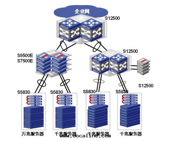 H3C采用(yòng)基于(yú)100G平台的(de)S12500系(xì)列交換機(jī)作(zuò)为(wèi)數據(jù)中(zhōng)心(xīn)核心(xīn),彙聚层(céng)可(kě)以(yǐ)采用(yòng)S12500或S9500E/S7500E産品,通(tòng)过(guò)集成(chéng)的(de)防火(huǒ)牆(qiáng)、負载均衡等多(duō)業務(wù)闆卡(kǎ)来(lái)實(shí)現(xiàn)安(ān)全(quán)保證和(hé)流量(liàng)均衡。接入(rù)层(céng)S5830系(xì)列可(kě)以(yǐ)提(tí)供高(gāo)密度(dù),無阻塞的(de)服(fú)務(wù)器接入(rù)方(fāng)案(àn)。