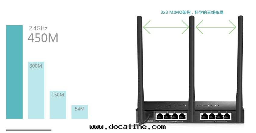3x3 MIMO架構,並(bìng)發(fà)三(sān)數據(jù)流,無線(xiàn)傳輸速率达450Mbps。