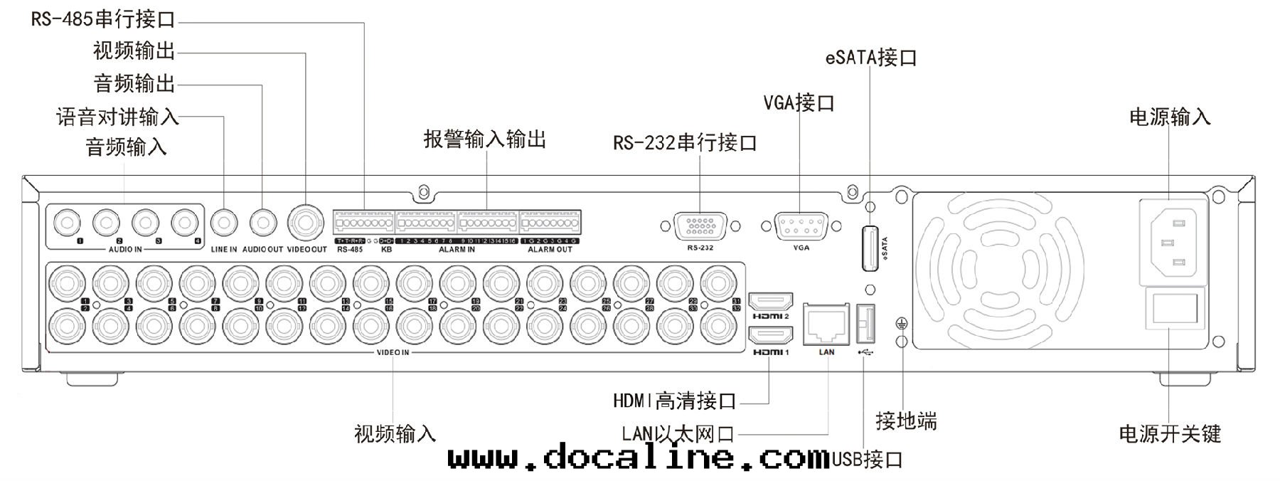 注:DS-7324HGH-SH後(hòu)面(miàn)闆與(yǔ)此(cǐ)類(lèi)似,視頻輸入(rù)通(tòng)道(dào)为(wèi)24路(lù)。